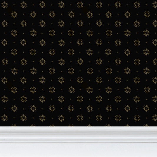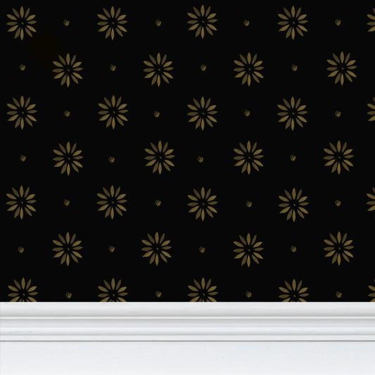 Medium Small Scale Black Stencil Petals on Gold/Mustard Wallpaper