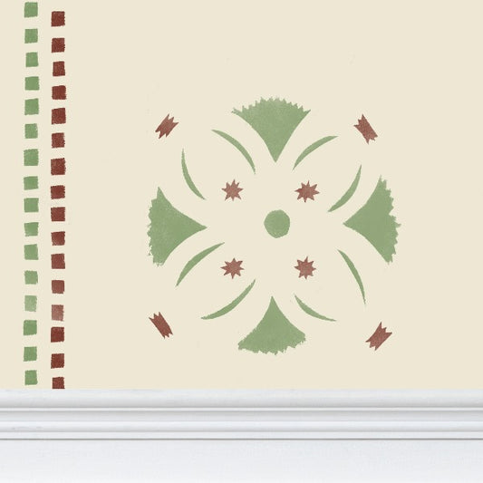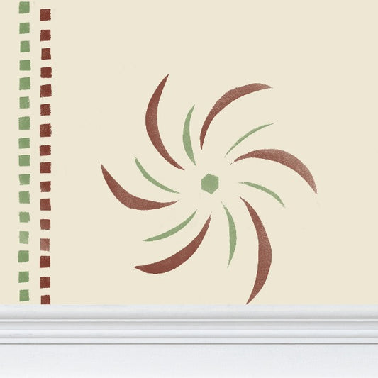 Red and Green Pinwheel Colonial Stencil on Tan background Large Scale